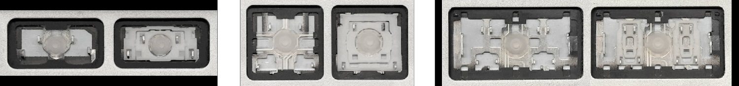 *I vissa tangentbordsmodeller används fler typer av fästen än de tre som visas på bilderna; vissa tangenter kan också ha metallgångjärn.