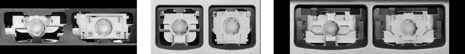 *I vissa tangentbordsmodeller används fler typer av fästen än de tre som visas på bilderna; vissa tangenter kan också ha metallgångjärn.