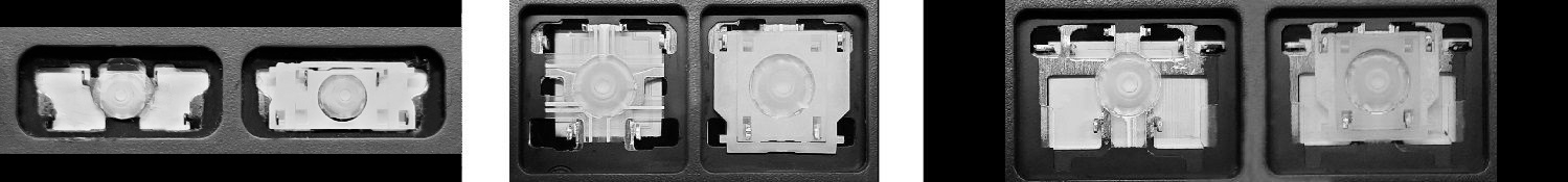 *I vissa tangentbordsmodeller används fler typer av fästen än de tre som visas på bilderna; vissa tangenter kan också ha metallgångjärn.